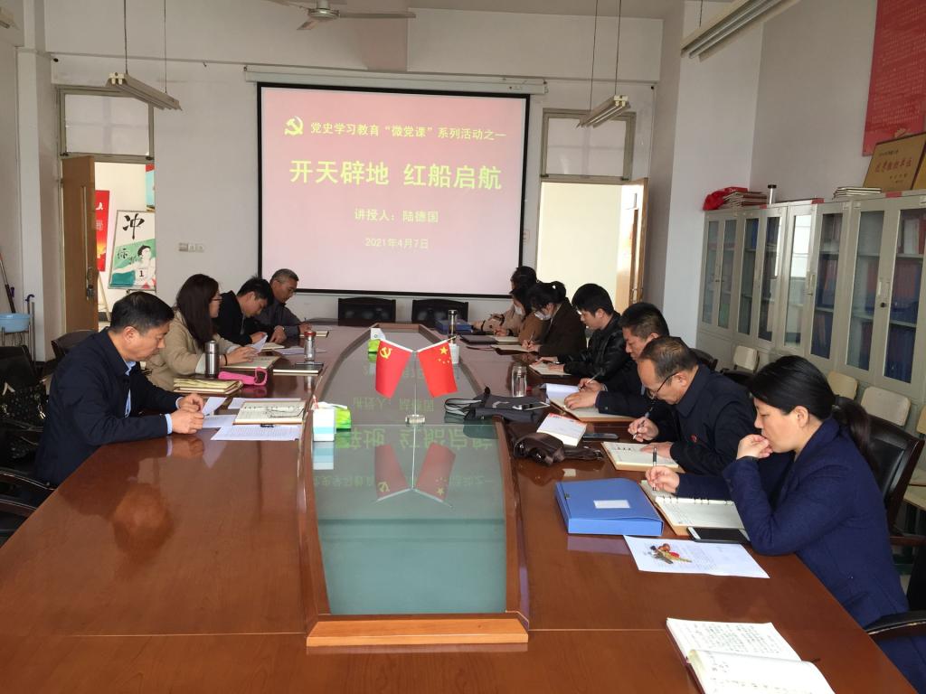 4月7日下午,william威廉英国官网党总支教工第一党支部在党员活动室开展学党史“微党课”活动。第一讲由学院党总支书记陆德国以《开天辟地、红船启航》为题,从“一大”的历史背景、成立的经过及历史意义等方面逐条讲述。