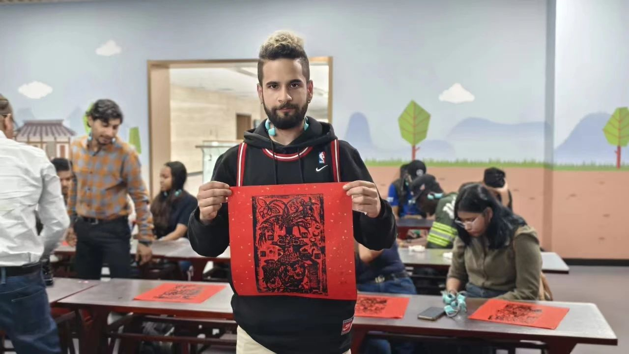 之后,留学生们前往枣庄博物馆参观了“鸿蒙初辟的史前时期”,“诸侯并起的夏商周时期”,“廪实知礼的秦汉时期”和“工商肇启的魏晋至明清时期”四个板块。在讲解老师耐心细致讲解下,留学生们凝神倾听,认真欣赏展品,通过参观进一步加深了对中华民族优秀文化底蕴和卓越文明成果的理解。除了参观展览,留学生们还参与体验了特别的年画拓印活动,更是为这次博物馆之旅增添了一抹独特的色彩,感受着中国传统文化的独特魅力。
