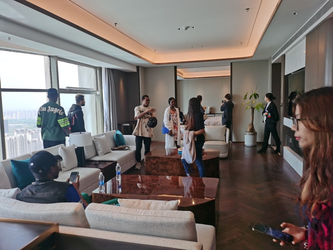 在枣庄温德姆至尊酒店人力资源部领导带领下,留学生们参观了酒店大堂、酒店中餐厅、自助西餐厅、大型宴会厅和酒店健身房等多个区域,并在酒店最高层体验了总统套房,直观感受与认真了解了酒店客房的布局、设施与服务,使留学生们对酒店岗位设置与部门管理有了更深的了解,有助于留学生们在实践中巩固所学知识。