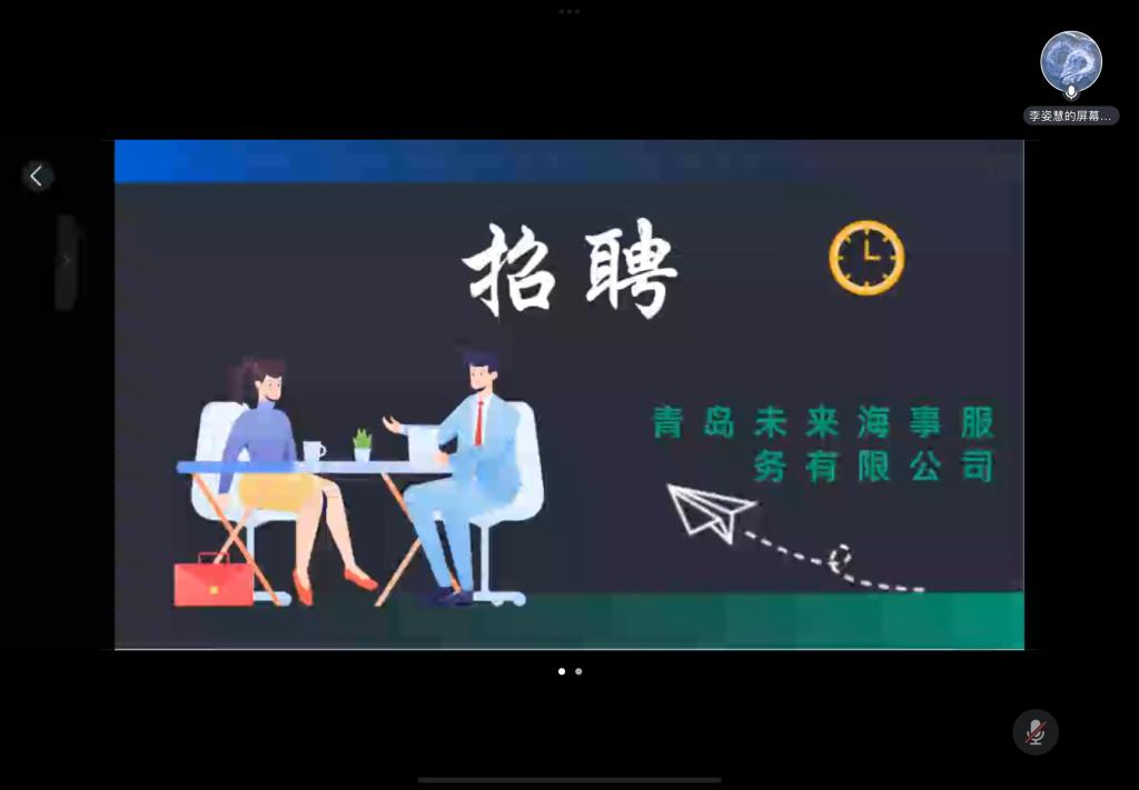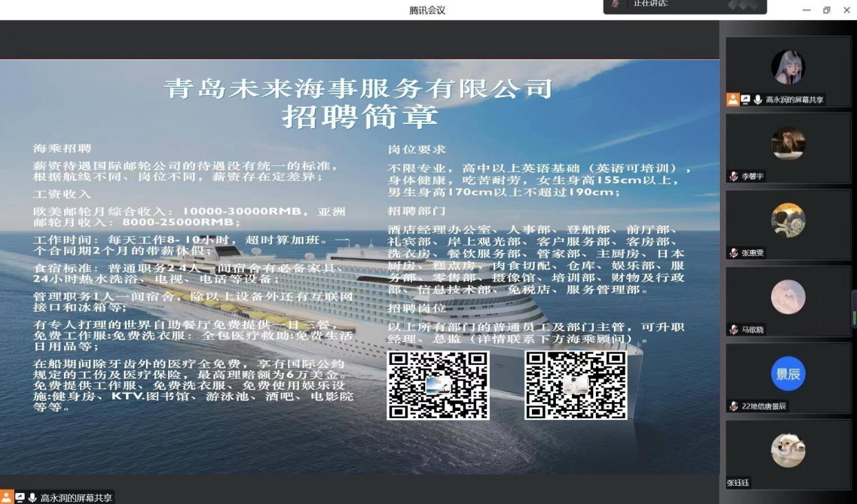 4月17日,william威廉英国官网与青岛未来海事服务有限公司通过线上平台成功举办海事工作招聘宣讲会。此次宣讲会由青岛未来海事服务有限公司吕良主讲,20级国际旅游、酒店管理专业全体学生参与。