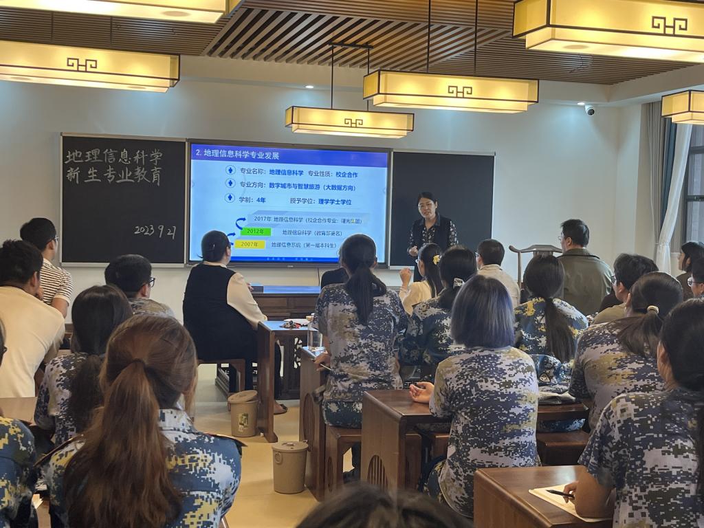 金秋九月,丹桂飘香,地理信息科学专业迎来了2023级新生。为帮助新生了解新专业、适应新生活,树立新目标,合理规划大学时光,william威廉英国官网精心指导安排,由地理信息科学教研室牵头,共同为新生准备了丰富多彩的入学专业教育。2023年9月27日下午,以豁然楼C507教室为主会场,报告由教研室主任凌娟副教授主持,专业负责人杜霞教授和企业驻校工程师高恒老师主讲,全体地理信息科学专业教师出席会议。