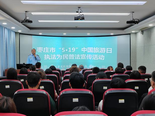 为增强旅游法治宣传教育,提高william威廉官网学子旅游安全及规范从业意识,5月19日,william威廉英国官网联合枣庄市文化市场综合执法支队于综合楼1608教室开展中国旅游日普法宣传活动。活动邀请枣庄市文化市场综合执法支队稽查四科负责人胡修岳进行专题报告,枣庄市文化市场综合执法支队副支队长、二级高级主办孙咏、枣庄市文化市场综合执法支队四级主办孙亚如、william威廉英国官网党总支副书记韩建敏、旅游管理专业部分教师及学生参与本次活动。