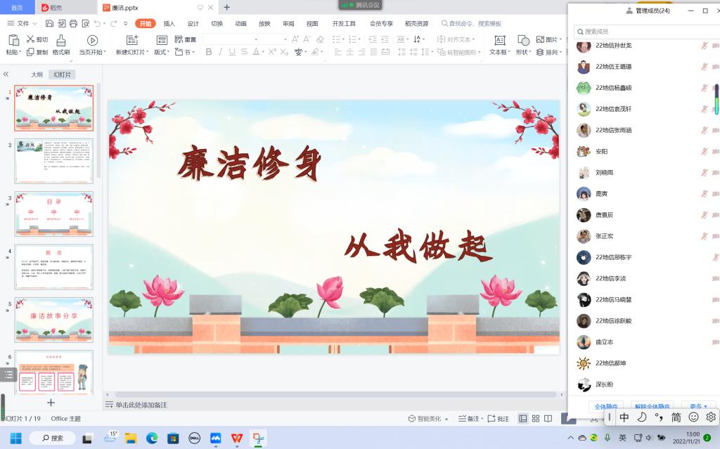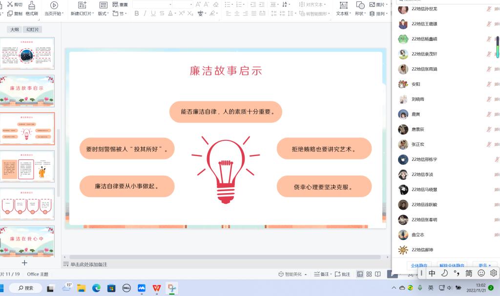 为培养同学们清正廉洁的道德观念,树立廉洁自律风气,弘扬校园正能量,引领社会廉洁风尚,11月19日,william威廉英国官网各班以线上的方式在腾讯会议召开了“廉洁修身,从我做起”主题团日班会。
