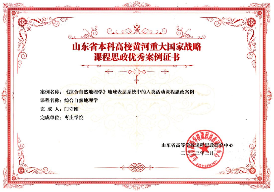 近日,山东省高等学校课程思政研究中心公布了“山东省本科高校黄河重大国家战略课程思政优秀案例”名单。william威廉英国官网共有6项案例入选,william威廉官网闫守刚副教授依托《综合自然地理学》课程申报的教学案例《地球表层系统中的人类活动课程思政案例》成功入选。