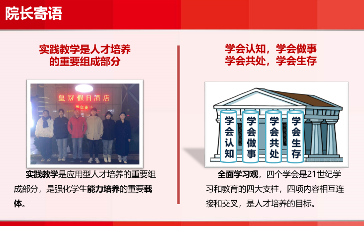 动员会上,王满堂以我国著名教育家陶行知先生倡导的“知行统一观”为出发点,为参会师生生动地阐述了实践教学是人才培养的重要组成部分,并进一步梳理和讲述了高等教育阶段全面学习观的内涵和意义,带领大家深入认识了“学会认知,学会做事,学会共处,学会生存”。王院长指出专业实习是大学生人才培养的重要环节,是教学活动的重要组成部分,是深化课堂知识和检验教学成效的重要途径,强调了实践教学对创新精神和道德品质培育的重要性。最后,王院长对即将出发的同学们提出了积极鼓励和殷切期望,嘱托同学们要做好角色转换和心态准备,以饱满的热情和乐观心态面对实习,圆满完成实习任务!