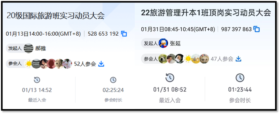 线上会议结束后,2020级国际旅游班和2022旅游管理升本班的同学们进行了实习单位的分组抽签,并最终确定了各个酒店的实习人员名单。学院实行“一师一企”指导教师制度,全程跟进学生实习情况,分组结束后,各指导老师与同学们进行了充分的交流并对同学们提出的问题和疑惑进行详细的解答。