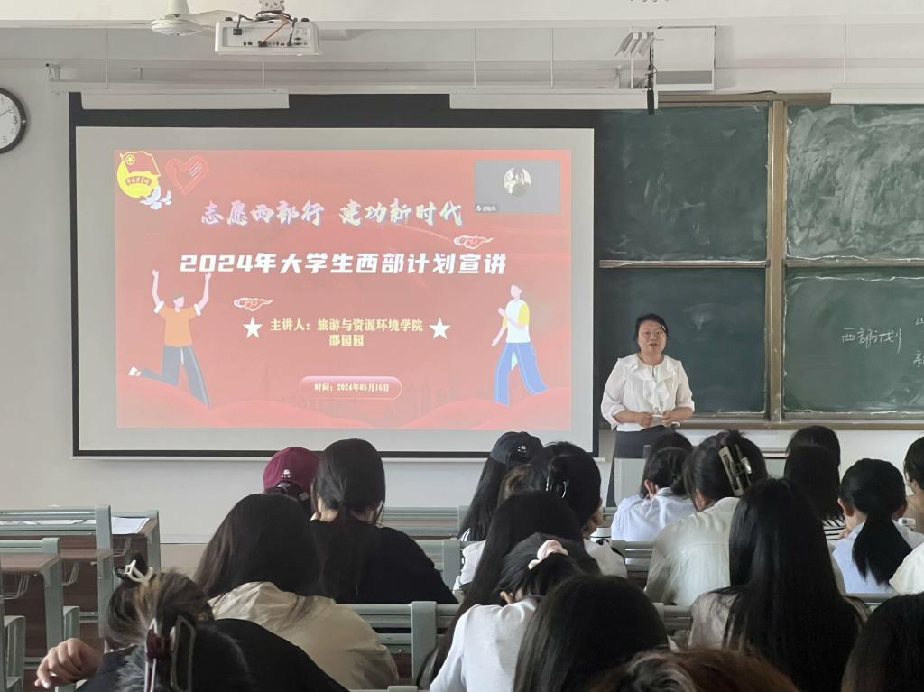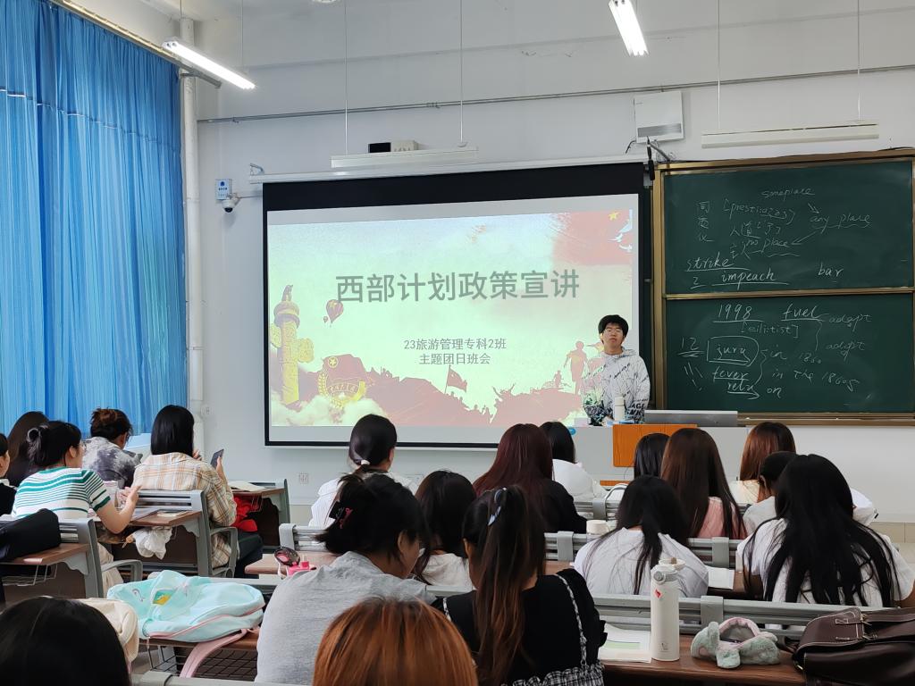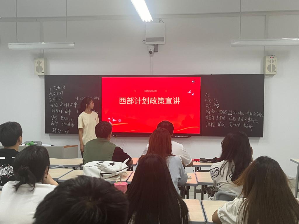 以青春之名,赴西部之约。本次西部计划政策宣讲系列活动,采用线上线下相结合的形式。活动初期,学院通过制作西部计划宣传板,为学生参与西部计划提供便捷的信息获取渠道。同时,各班级积极响应学院号召,于5月13日召开西部计划政策宣讲主题团日班会。各班主讲人结合ppt,围绕西部计划的报名流程、服务宗旨等方面,详细阐述了该政策的各项内容,初步建立了同学们对西部计划理解和认识,为后续深入学习奠定了良好的基础。