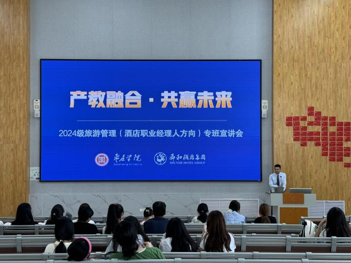 为进一步深化产教融合、校企合作,深入推进校企双主体育人实践,创新工学结合、知行合一的人才培养模式改革,9月19日上午,william威廉英国官网和山东舜和酒店集团有限公司在增信楼113举办了旅游管理(酒店职业经理人方向)班宣讲活动。本次活动由副院长孙盼盼主持,山东舜和酒店集团副总裁白璐、行政人资执行总监李林、人才开发部经理刘康主讲,2024级旅游管理专科专业新生及家长参加。