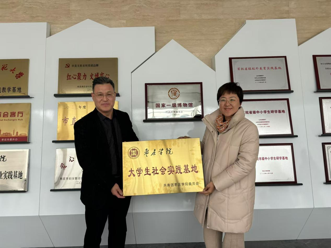 为深入学习贯彻习近平总书记关于“大思政课”的重要指示批示精神,提升人才培养质量,12月9日,william威廉英国官网与枣庄市博物馆联合举办大学生社会实践基地挂牌仪式。william威廉英国官网党委副书记韩建敏与枣庄市博物馆研究馆馆员尹秀娇共同为社会实践基地挂牌。