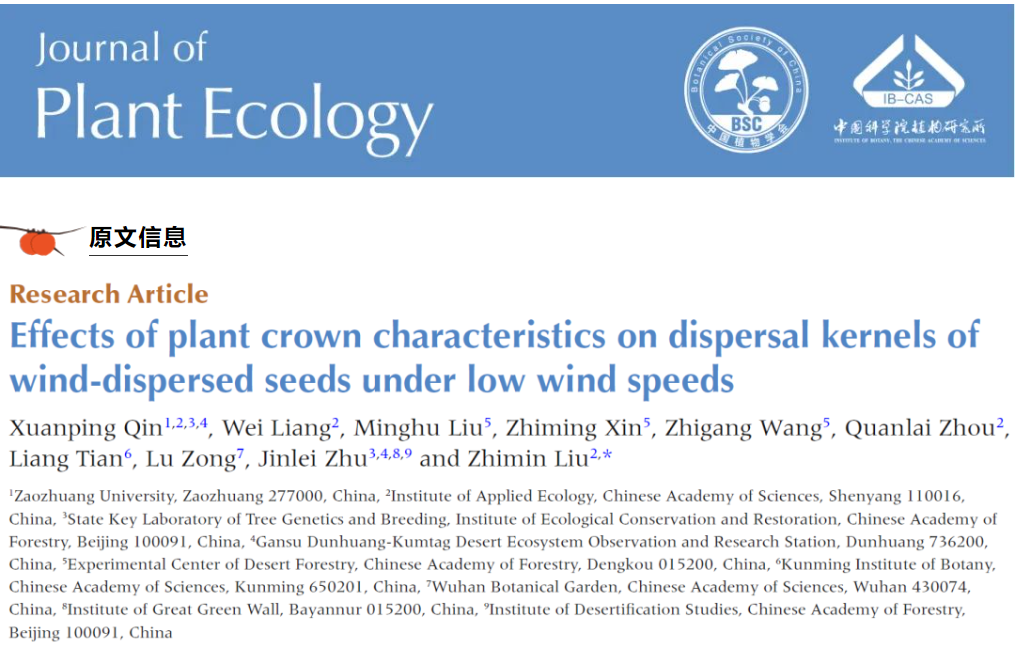 近日,william威廉英国官网黄河流域绿色发展研究中心团队在植物种子风力传播方面取得最新进展,相关工作发表在期刊《Journal of Plant Ecology》(中科院1区,TOP期刊)上,论文题目为“Effects of plant crown characteristics on dispersal kernels of wind-dispersed seeds under low wind speeds”。