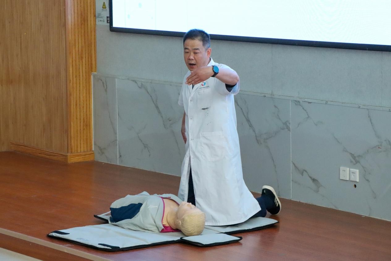 活动中,枣庄市妇幼保健院营养内分泌科主任、主任医师金晨作了《吃动平衡、健康体重》的讲座。她通过翔实的数据指出大学生每日应摄入12种以上食物;针对学生常见的“快餐依赖”“久坐少动”等习惯,她强调:“体重管理的关键在于能量平衡,建议每周至少进行150分钟中等强度运动,如快走等。”在互动环节,组织同学们跟随健身视频进行运动练习。急诊科副主任医师史玉佳作了《急救知识培训》的讲座,在现场演示了心肺复苏等急救操作,向同学们详细讲解按压位置、手法、频率等关键要点。