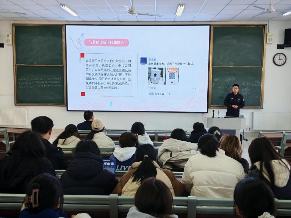 为深入推进党建引领校园安全工作走深走实,提高风险防范处置能力,11月19日,旅游与资源学院在崇德楼4208教室开展防诈骗主题讲座。本次活动特邀薛城公安分局沙沟派出所民警刘浩元主讲,部分2025级学生和师生参加。