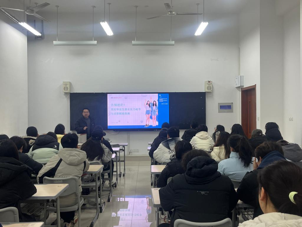会议伊始,周赢通过解读就业政策和往年就业数据,客观细致分析当前就业形势,助力同学们树立正确就业价值观。随后,周赢从就业压力疏导和求职方法分享两个方面展开讲解:一方面,周赢针对毕业生求职过程中存在的迷茫焦虑等共性问题,倾情分享缓解就业压力和疏导焦虑情绪的科学方法;另一方面,周赢系统传授求职技巧,详细介绍简历打磨方法与面试沟通技巧,培养学生在面试中临场应变的能力,帮助同学们提升求职核心竞争力。最后,周赢鼓励同学们要结合自身实际进行职业定位,始终保持主动进取的态度,以扎实技能和良好心态从容应对求职过程中的各种挑战。