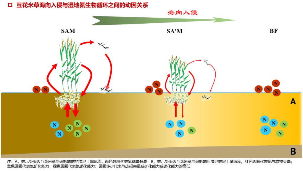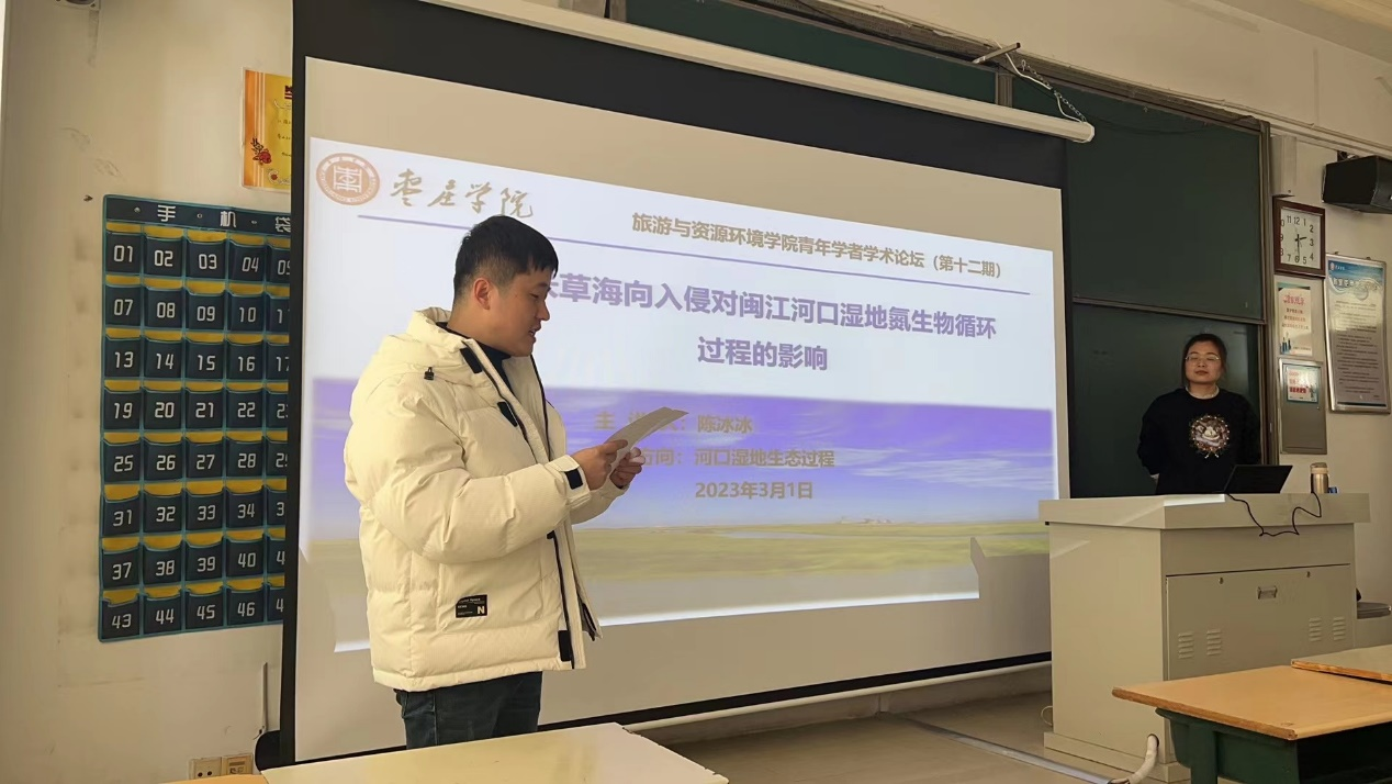 报告会上,陈冰冰博士做了题为“互花米草海向入侵对闽江河口湿地氮生物循环过程的影响”的学术报告,介绍了互花米草自身特性(极强的促淤能力)对潮滩湿地环境的改变以及对生源元素循环过程的影响,尤其是对氮生物循环的影响。以闽江河口鳝鱼滩湿地互花米草入侵前的光滩、入侵1年互花米草湿地和入侵7年互花米草湿地为研究对象,通过野外定位采样、野外原位培养试验和野外模拟淤积强度分解试验,探讨了互花米草海向入侵影响下湿地植物-土壤系统氮时空分布、转运、转化及主要功能微生物群落特征,揭示了互花米草海向入侵对湿地氮生物循环的关键影响机制,明晰了互花米草海向入侵与湿地氮生物循环之间的动因关系。研究结果不仅为深入了解互花米草入侵影响下河口湿地氮生物循环过程提供理论依据,还从维持潮滩湿地氮库稳定性角度,为下一步海向入侵的互花米草治理提供了新思路。