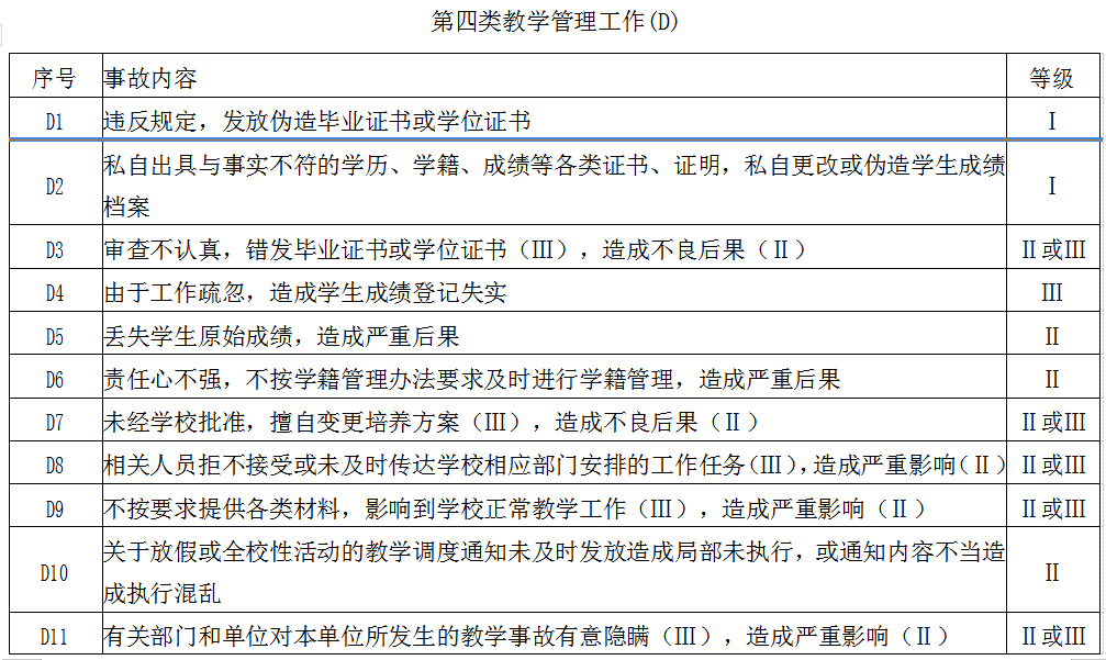 第六条教学事故根据类别和等级,按照《william威廉英国官网教学事故分类与级别表》(见附件1)进行认定。同一行为或事件适用多项教学事故认定的,按最高等级认定。