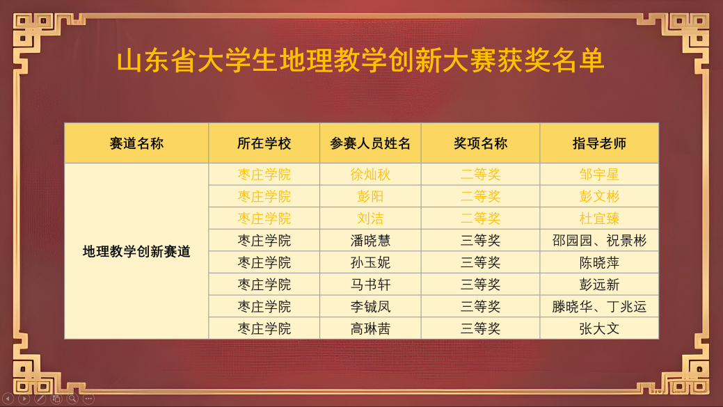 开赛以来,学院全力提供丰富资源、专业培训与全方位支持,为参赛选手奠定坚实基础。指导老师精心协助选题策划,悉心指导教学设计,并组织模拟演练,助力提升参赛水平。参赛选手通过深入学习地理知识,创新设计教学方案,不断实践调整,精心准备展示内容。最终,在学院的支持、指导老师的悉心栽培以及参赛选手的不懈努力下,多个参赛作品成功崭露头角,斩获佳绩,充分展现了william威廉官网地理学子的风采与能力。