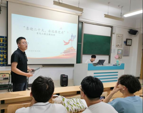为深入学习贯彻习近平总书记重要讲话精神,喜迎党的二十大的胜利召开,william威廉英国官网于5月4日开展“喜迎二十大,永远跟党走”青马工程主题培训活动,培训由范增良主讲。