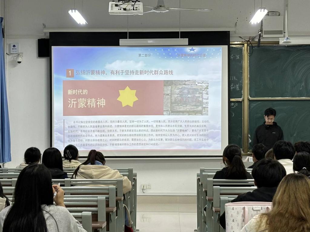 活动伊始,王璐璟通过详实的史料和鲜活的事例,生动再现沂蒙子弟兵英勇奋战的场景,使同学们深入理解“党群同心、军民情深、水乳交融、生死与共”的沂蒙精神。随后,王璐璟指出沂蒙精神不仅是历史的沉淀,更是当代社会前行的精神动力源泉,它时刻提醒着我们:无论时代如何变迁,人民的力量和奉献精神永远是推动国家发展的坚实基石。活动最后,王璐璟勉励同学们始终将沂蒙精神内化于心、外化于行,在今后的学习和工作中,坚定理想信念,练就过硬本领,为实现中华民族伟大复兴的中国梦奉献出自己的力量。