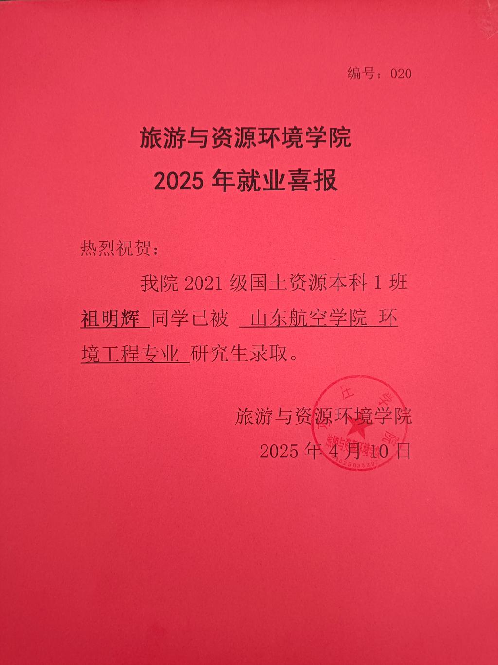 喜报!21国土资源本科1班祖明辉被山东航空学院录取!
