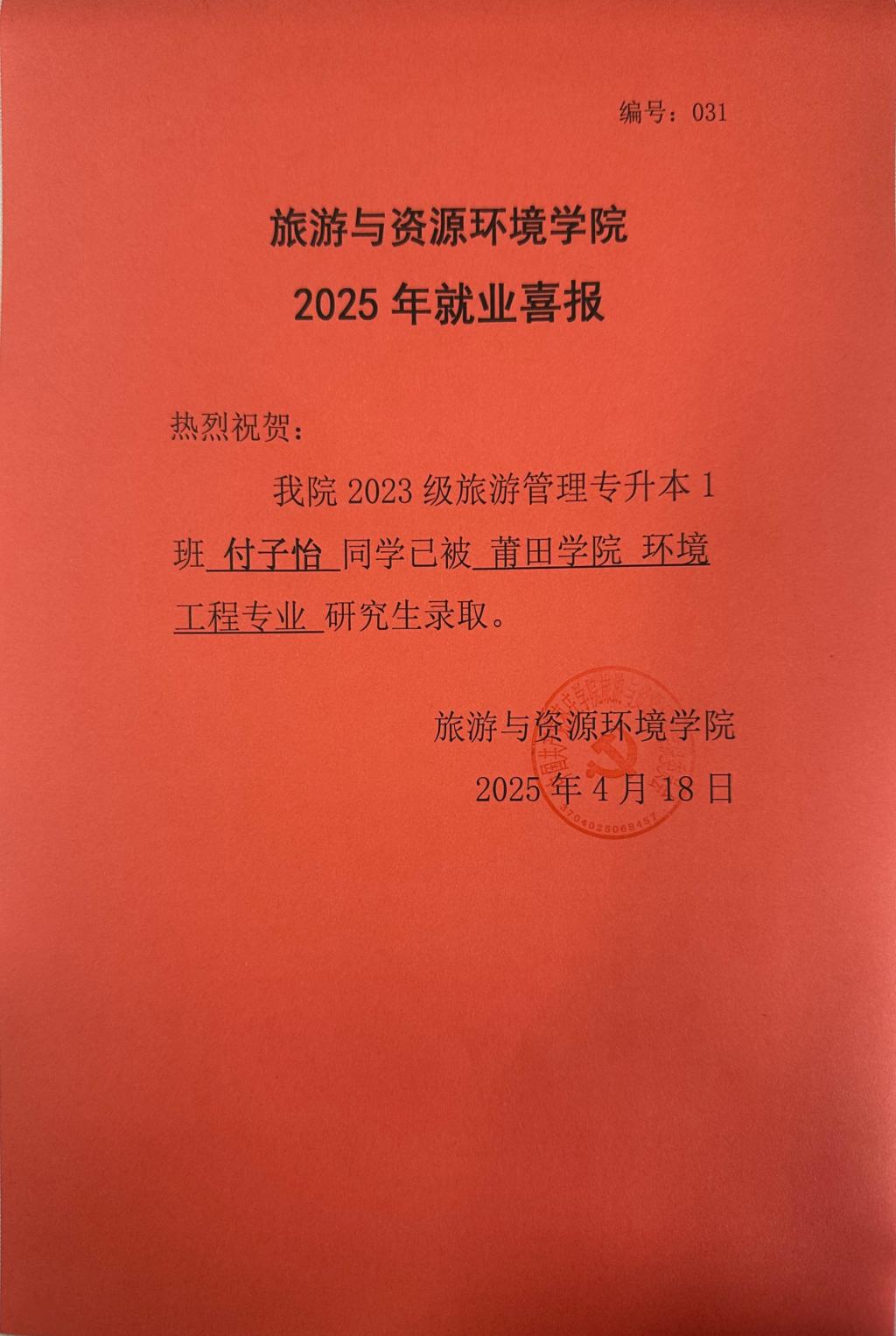 喜报!23旅游管理升本1班付子怡被莆田学院录取!