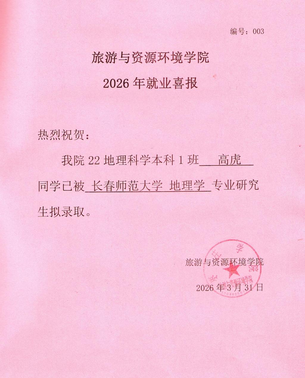喜报!22地理科学本科1班高虎被长春师范大学录取!